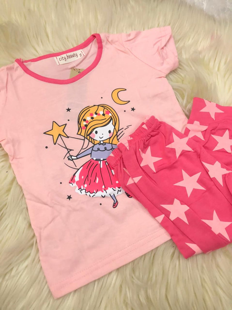اجعلي صغيرتك تنعم بالراحة الكاملة باختيار لها هذا الطقم الرائع، يتكون من تيشيرت بياقة مستديرة وطبعات جذابة،وبنطلون بيجاما بخصر مطاطي مريح، مصنوع من خامة عالية الجودة، لطيفة على البشرة لارتداء مريح طوال اليوم.