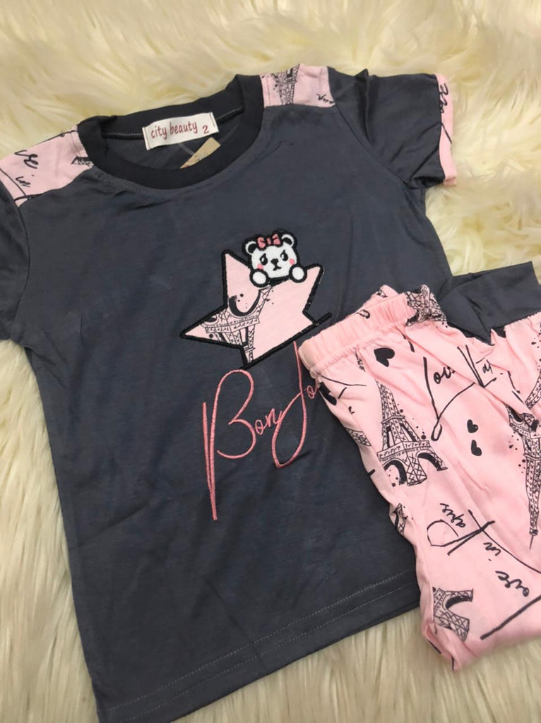اجعلي صغيرتك تنعم بالراحة الكاملة باختيار لها هذا الطقم الرائع، يتكون من تيشيرت بياقة مستديرة وطبعات جذابة،وبنطلون بيجاما بخصر مطاطي مريح، مصنوع من خامة عالية الجودة، لطيفة على البشرة لارتداء مريح طوال اليوم.